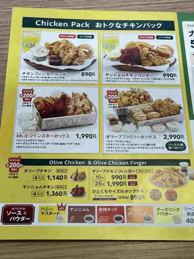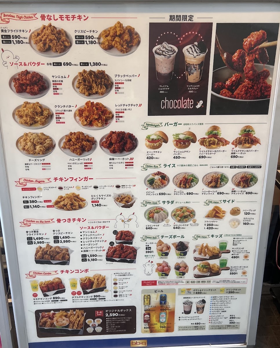 From a reviewer’s perspective, the menu at Bb.q Olive Chicken Café Sasazuka feels concise yet thoughtfully curated, making it easy to grasp the brand’s strengths at a glance. The takeaway selection highlights both comfort and convenience, starting with the soothing Matcha Latte, which adds a familiar Japanese touch to the café-style offerings. For those looking for a complete meal, the Bb.q Burger Lunch stands out as a practical and satisfying option, combining indulgence with portability. The heart of the menu, however, clearly lies in its fried chicken. The boneless thigh Golden Fried Chicken (4 pcs) and Golden Fried Chicken (8 pcs) showcase the restaurant’s signature style-crispy on the outside, juicy on the inside, and well-suited for sharing or solo enjoyment depending on portion size. Meanwhile, the Chicken Fingers (3 pcs, boneless) provide a lighter, snack-friendly alternative without sacrificing flavor. Overall, the menu strikes a good balance between drinks, burgers, and fried chicken, reinforcing Bb.q Olive Chicken Café Sasazuka’s identity as a reliable stop for flavorful, takeaway-friendly comfort food.